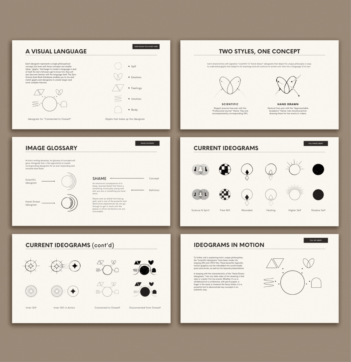 From there, I developed a symbolic visual language of custom ideograms—minimal forms designed to help audiences see ideas that are often felt more than spoken. Some were animated to support his talks, illustrating concepts like the way shame can close the heart to light.