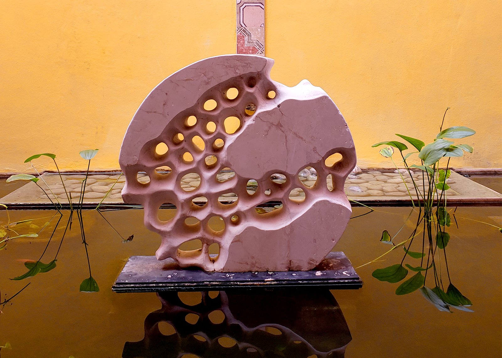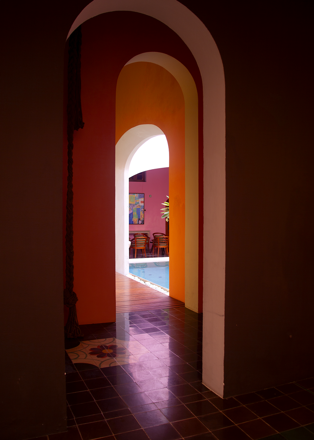 A strong relationship between inside and outside means that walking through the property, past water gardens, sculptures, and airy walkways, you’re never quite sure what the difference is. Oversized rope art installations are a modern nod to the henequen (sisal) fiber that created the wealth of the bygone era and bright paintings adorn the walls. In the rooms, wood doors open to a terrarium and tall windows reveal a private outdoor soaking tub.